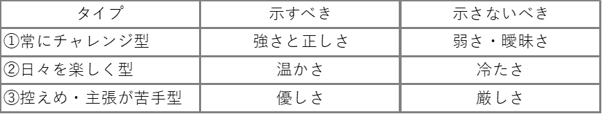 ①常にチャレンジ型には強さと正しさを示し、弱さ・曖昧さを見せない。